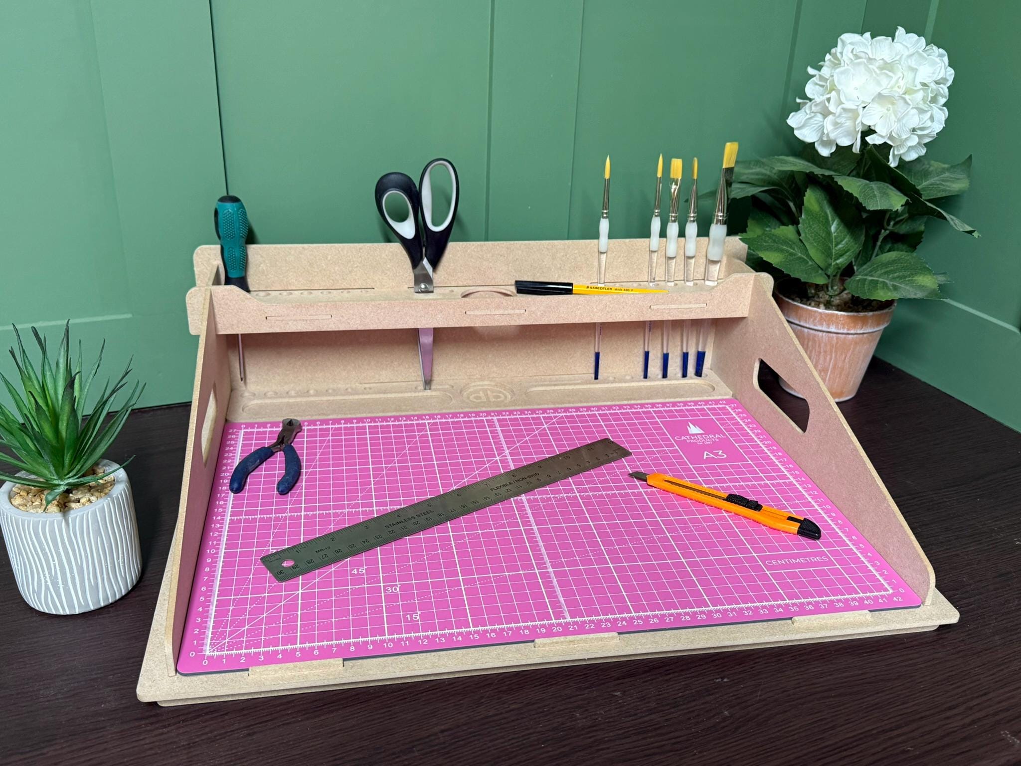 The Workstation simply slots together, thus can be taken apart and stored flat, made from 4mm premium MDF, it can also be painted by the owner.